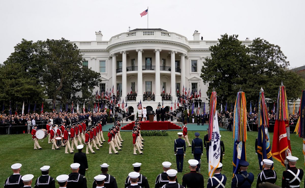 After the welcome ceremony the highlight of the visit is a state dinner. Trump choose to dispense with Obama's tent that was erected on the lawn so Barack and Michelle could party with Hollywood celebrities and choose the more intimate, formal and historic setting of the White House state dining room. But first, another welcome and more photos: